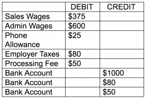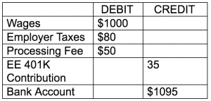 Wages include the money the employee takes home and the taxes the employee pays. Employer taxes are just that – only the employer portion of payroll taxes. The payroll service will debit that amount from your bank either all together (as in the example above) or separately (as in the example below).